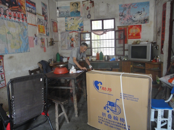2017年7月6日、上午9点、我村会计李小翟、村委委员周盛刚两名同志前往残疾人周银来家中、为其送上了崭新的轮椅一台、周银来系我村五保贫困户、由于身患残疾、行动不便、村委考虑到该户的实际情况、在县残联为其申请了一台轮椅、极大解决了患残带来的诸多不便、充分体现了各级政府对残疾人的关心和重视。