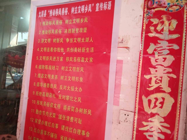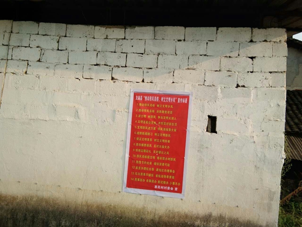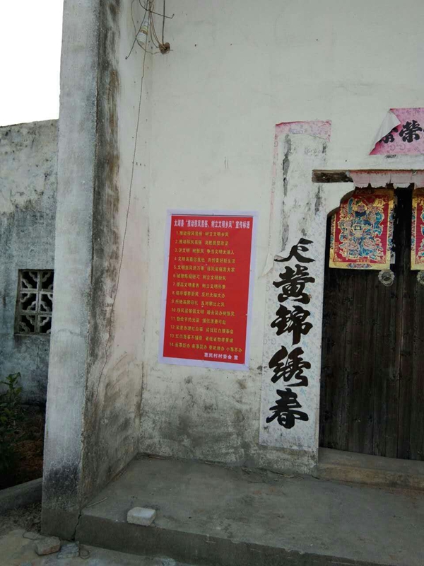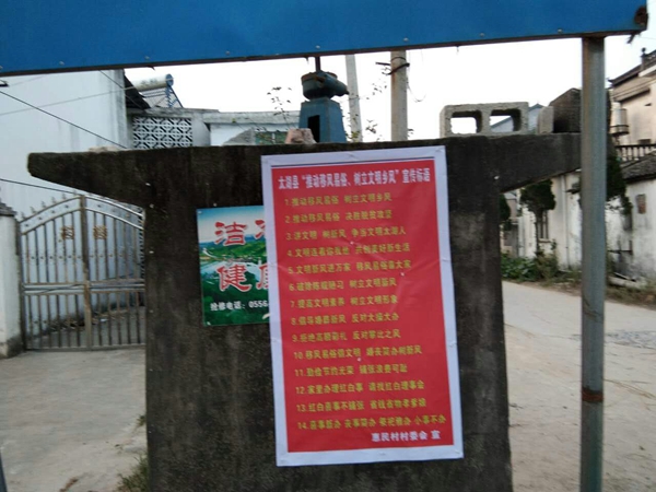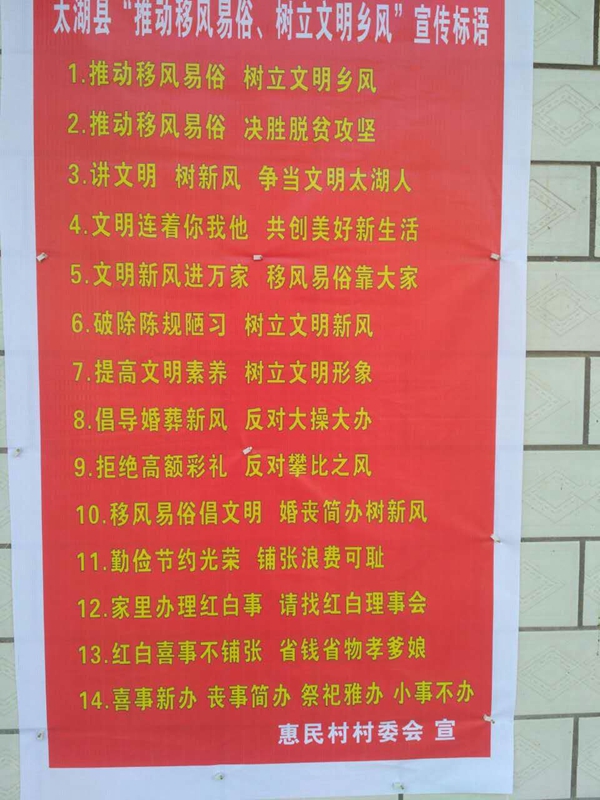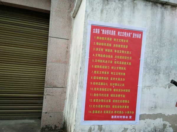 今天早上6:30分开始、我村民兵营长周传文、村委委员周盛刚两名同志在全村范围内醒目区域、重要道路、人员集中地及各屋场宣传和张贴太湖县“推动移风易俗、树立文明乡风”标语、鼓励大家树立文明、节俭的好习惯好风尚、争做文明勤俭惠民人。。