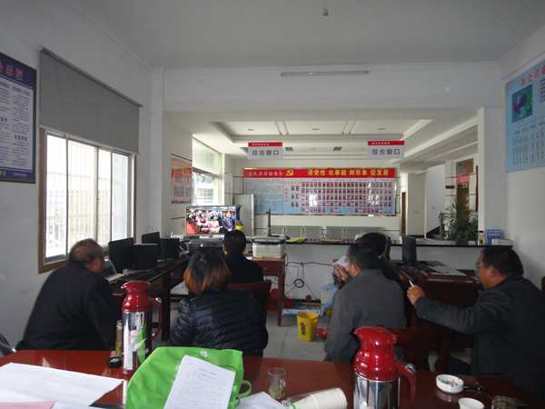 2017年10月18日上午8点、村两委和部分群众在一楼大厅集中观看了十九大开幕会直播、参加观看的有:李劲松 李锡根 周传文 王爱娥 周盛刚 李根枝 曹刘海 群众代表:曹诗银 周胜奇 (村委缺席的有 李小翟 甘凤林 两人因到县政府参加2017年人口普查会议)
