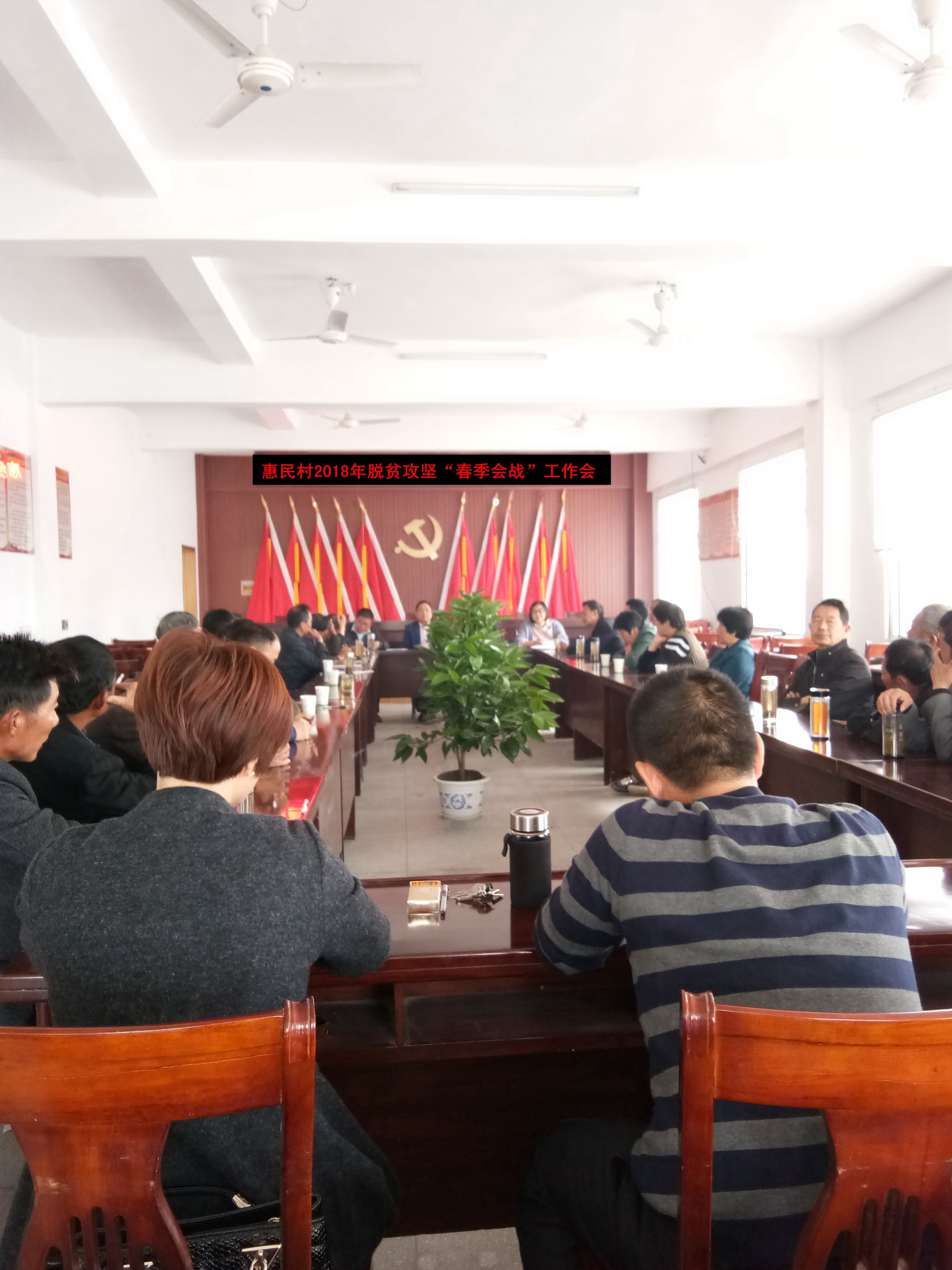 根据扶贫工作安排、2018年4月11日、我村在三楼会议室组织召开了惠民村2018年脱贫攻坚“春季会战”工作会、会议由村书记李劲松同志主持、两委其他成员、各党小组长、各村民小组组长和部分帮扶人出席了此次会议、会议要求大家全力以赴做好春季会战的各项扶贫工作。