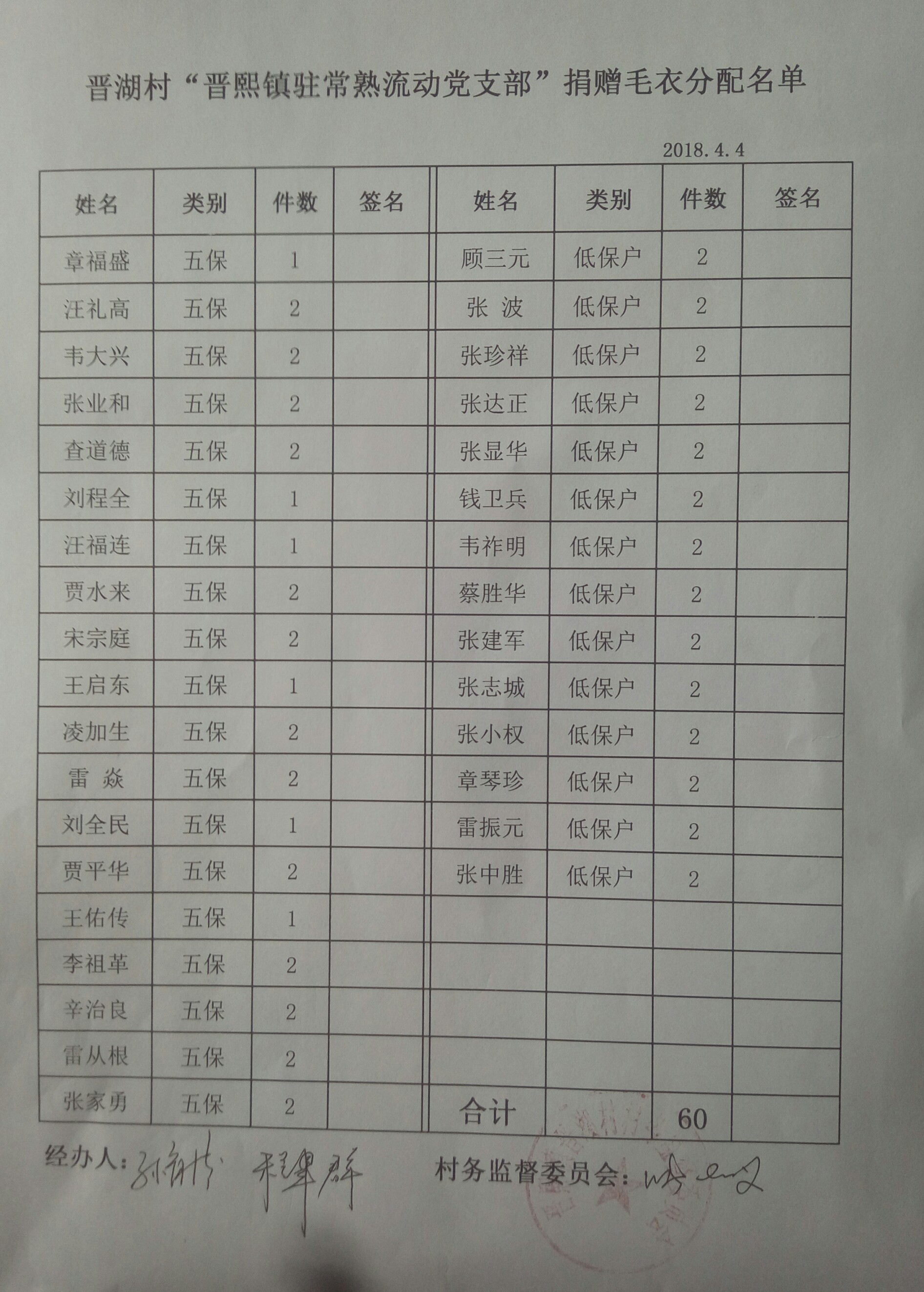 晋湖村“晋熙镇驻常熟流动党支部”捐赠毛衣分配名单