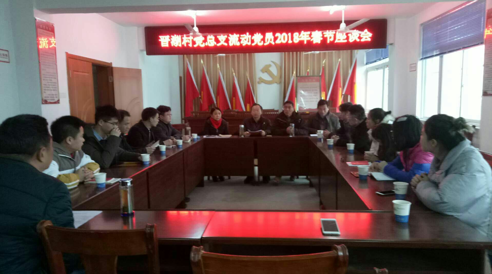 2018年2月14日,晋湖村党总支召开了流动党员座谈会,会上,学习了“党章”和“十九大报告”,向大家介绍了2017年村里工作情况,流动党员进行了座谈,还组织流动党员过“党员政治生日”。