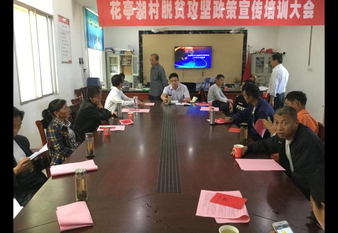 2017年5月18/19日,在花亭湖村村部会议室召开脱贫攻坚政策宣传培训大会,驻村工作队队长朱家龙亲自主持,带领贫困户学习扶贫政策!刘庭雍书记解答贫困户的提问。会后,每位贫困户都领取了由花亭湖村委会印刷的扶贫宣传画册。